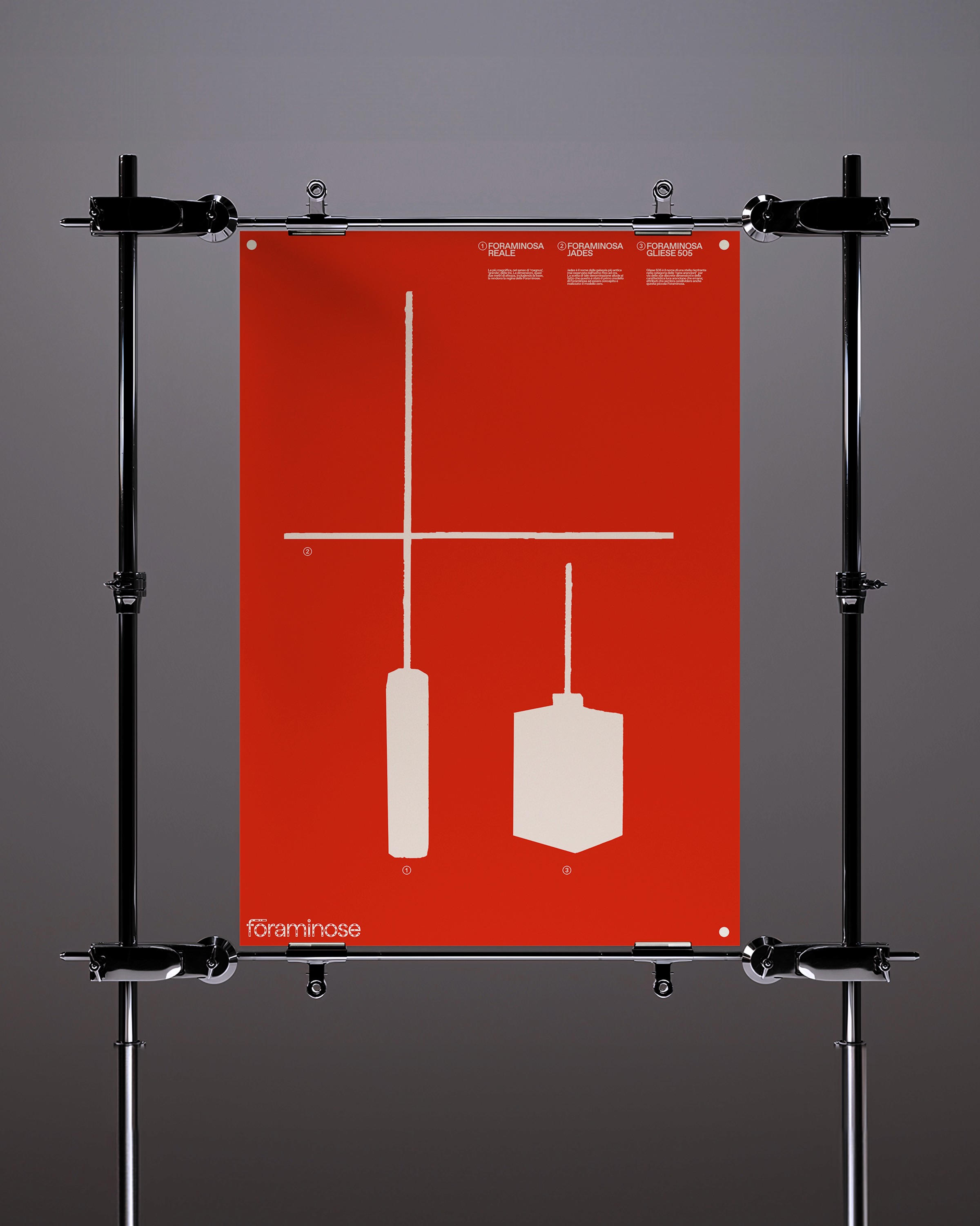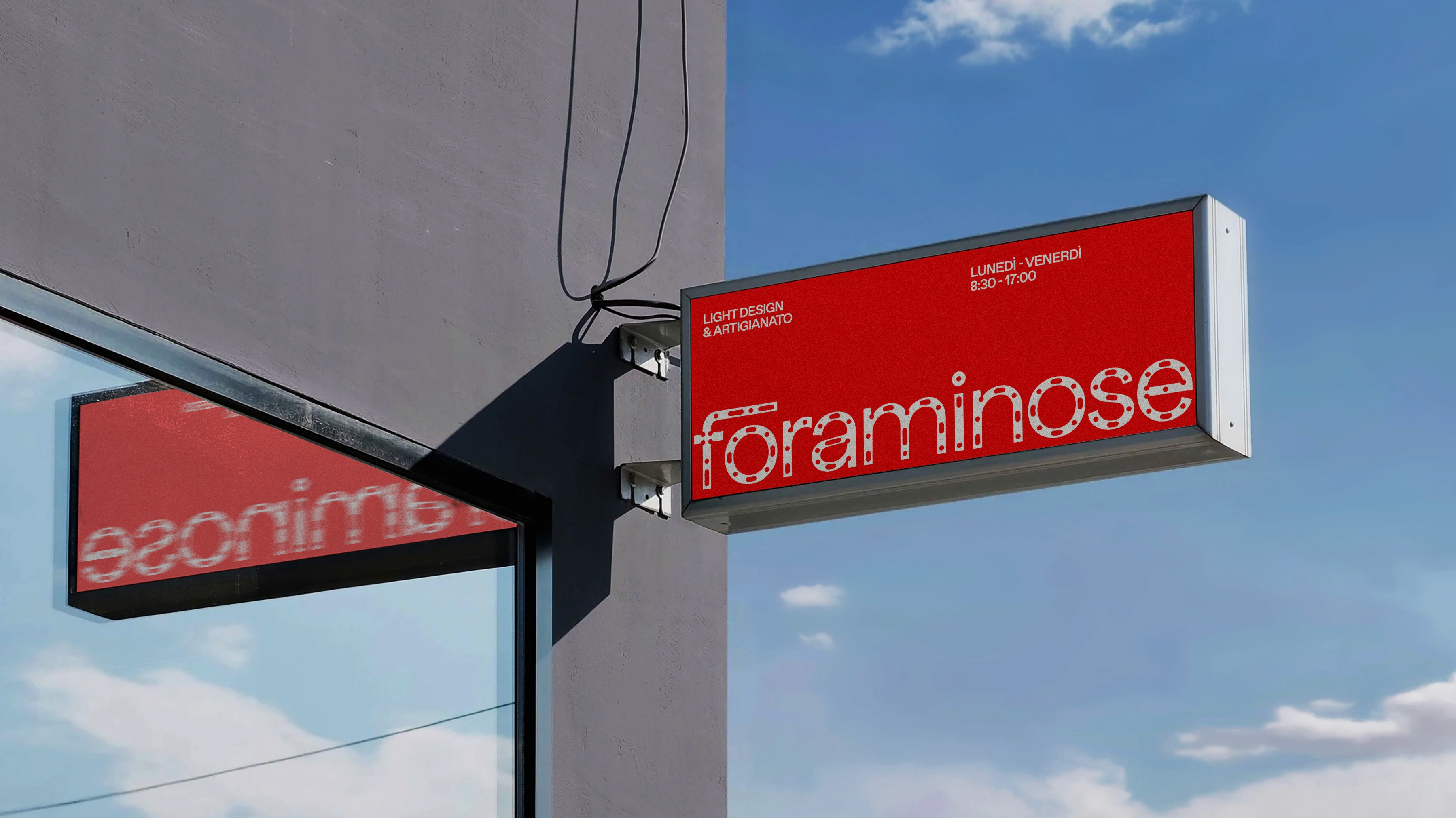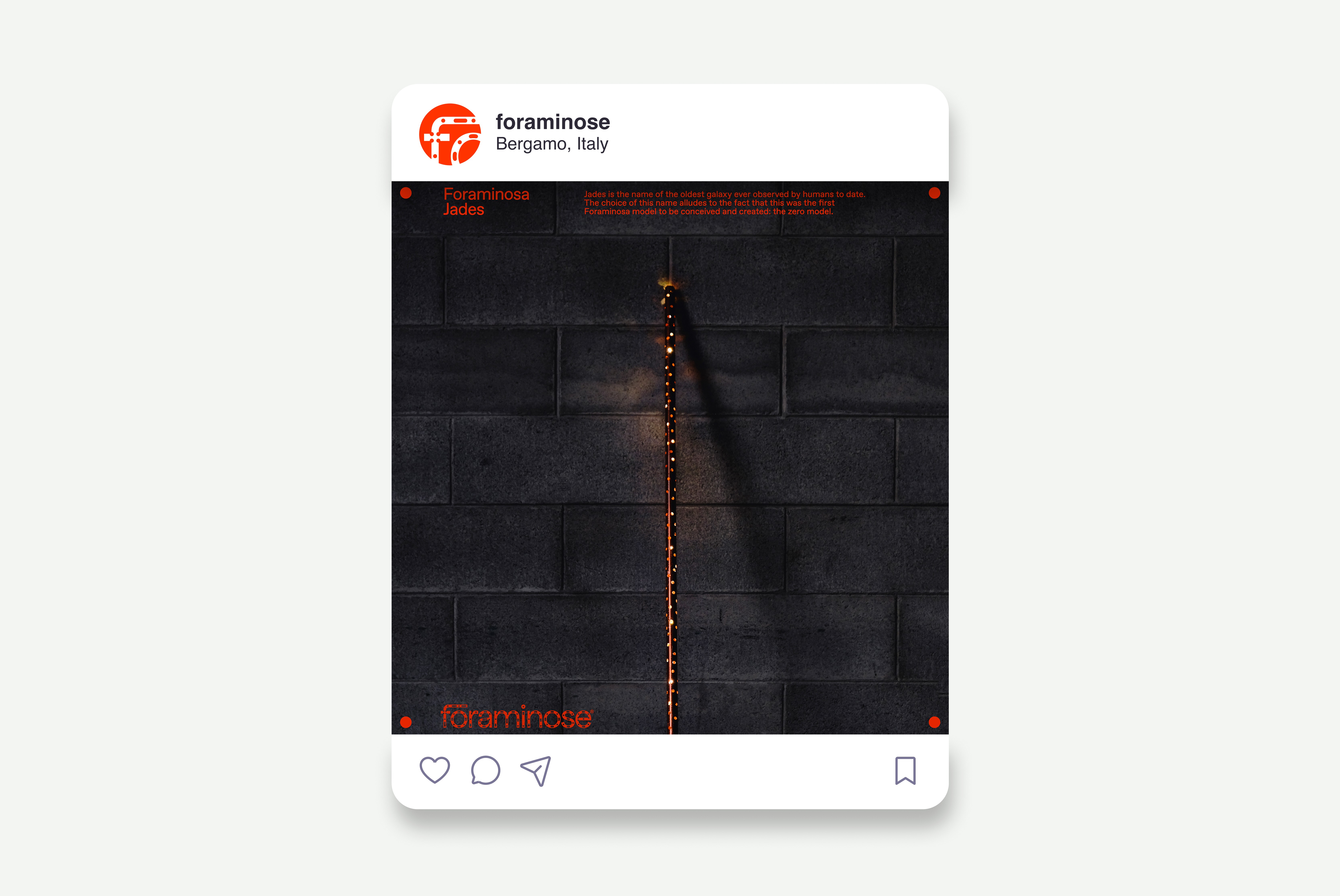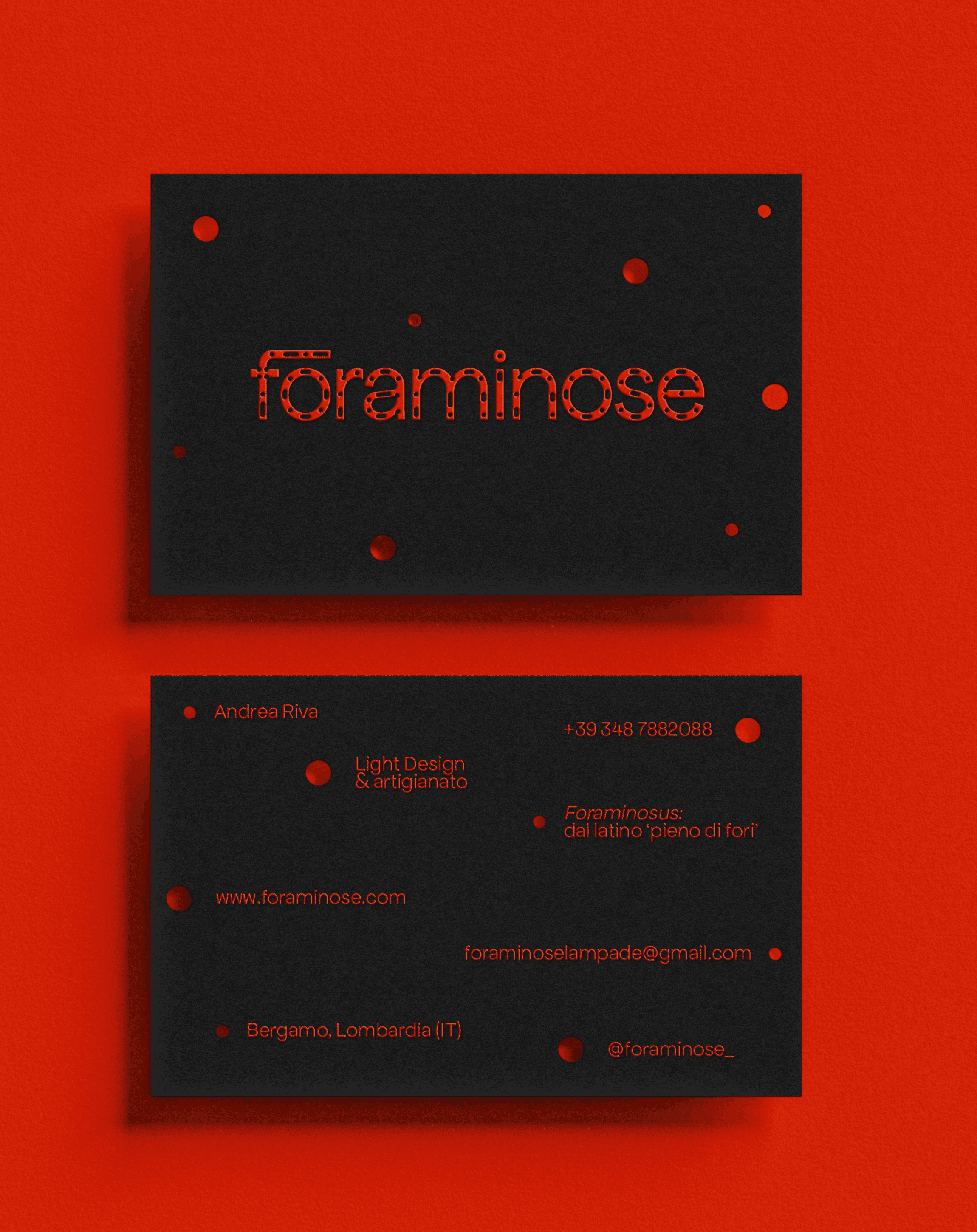 Foraminose is a series of hand-crafted lamps created by artist and artisan Andrea Riva. Beyond mere objects, Foraminose is the result of Riva's physical and philosophical research on light and surfaces. I have been approached by Riva and asked to create an identity that could enhance the spiritual value of his project. Riva works with waste materials, particularly copper. He uses copper tubes and pierces them manually to create objects that radiate light in unexpected ways from the many irregular holes.The resulting identity is rooted in the very appearance of the objects. I designed a bespoke wordmark that resembles the aesthetic of the lamps and paired it with a vibrant orange that refers to the material.
