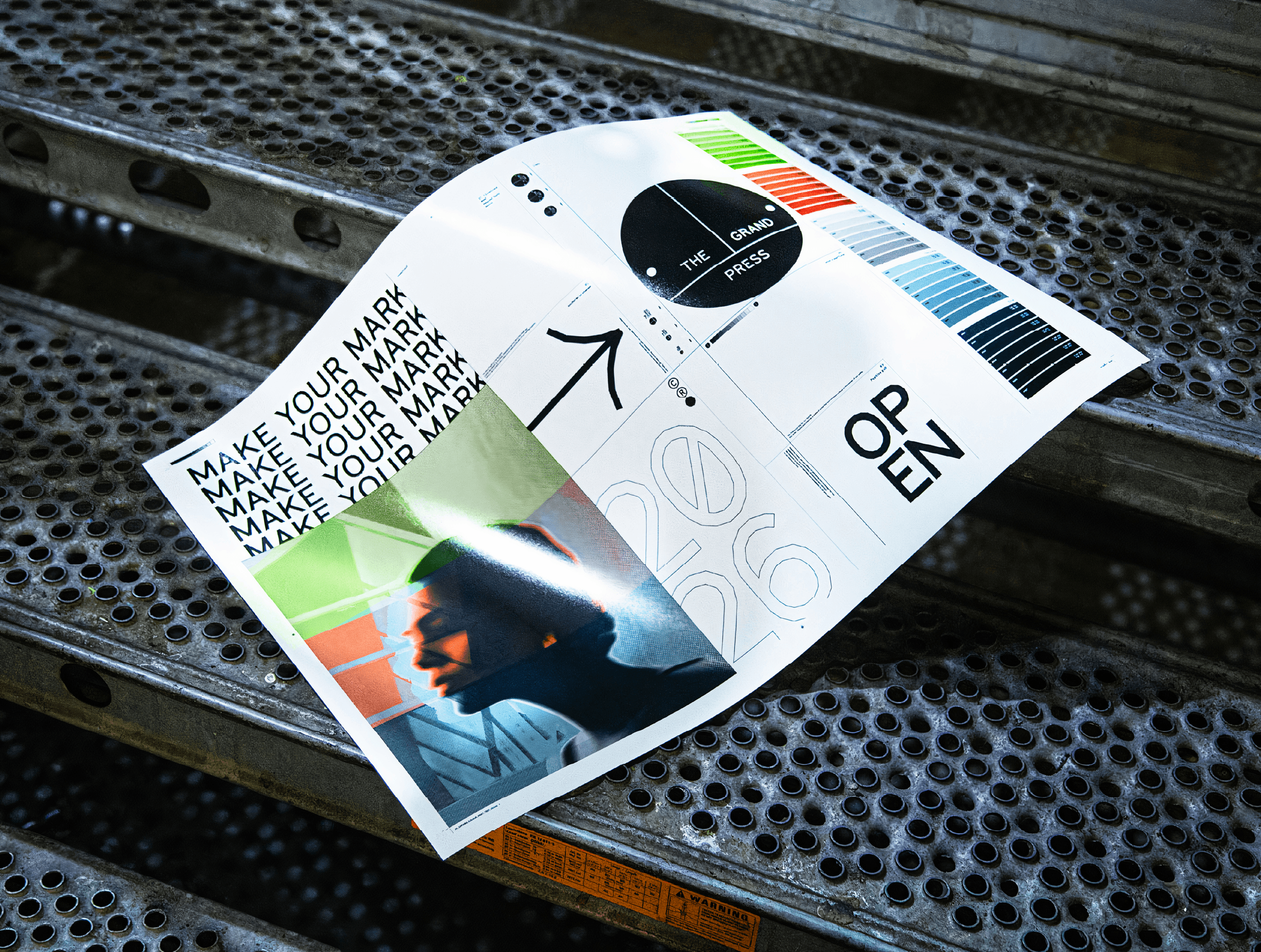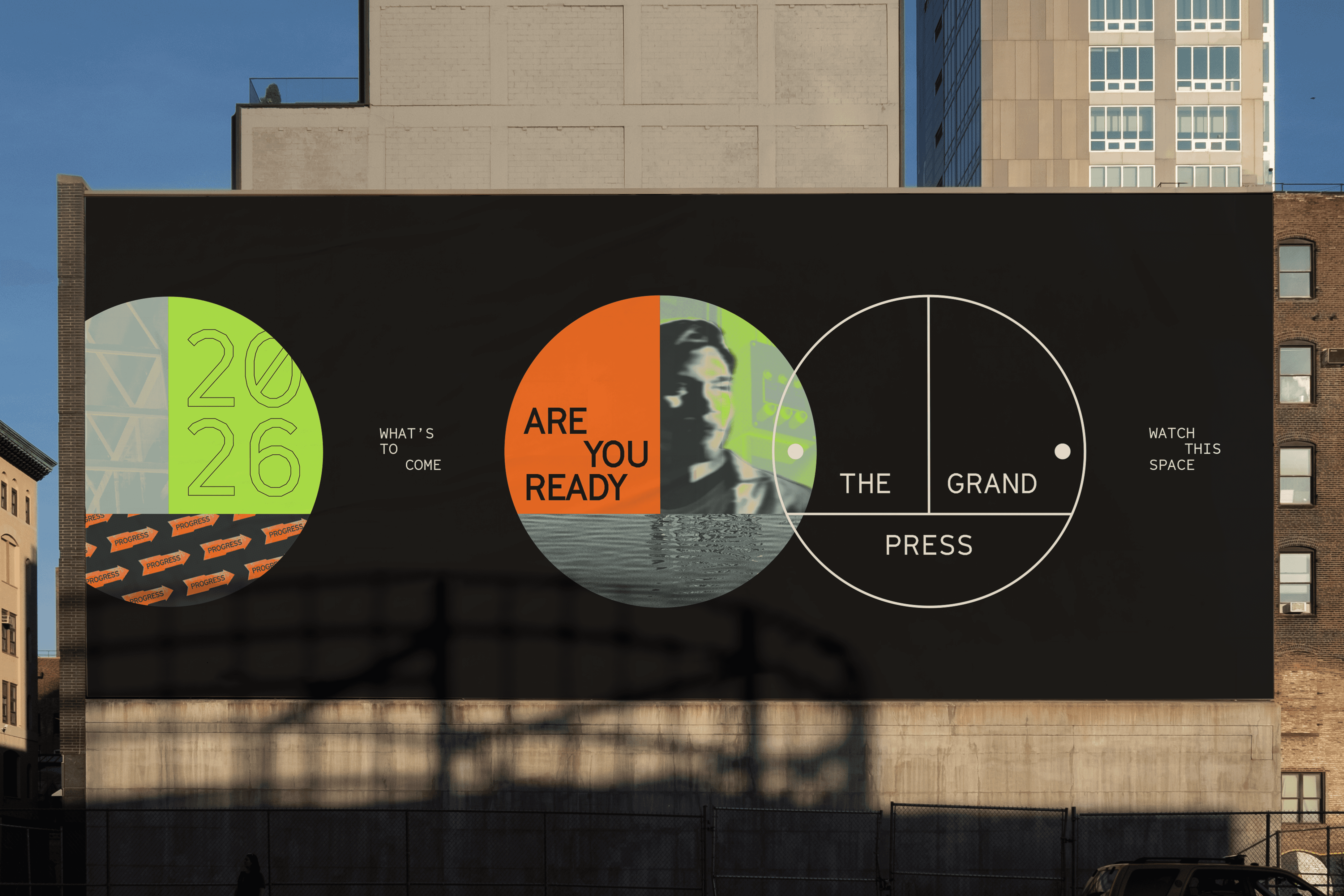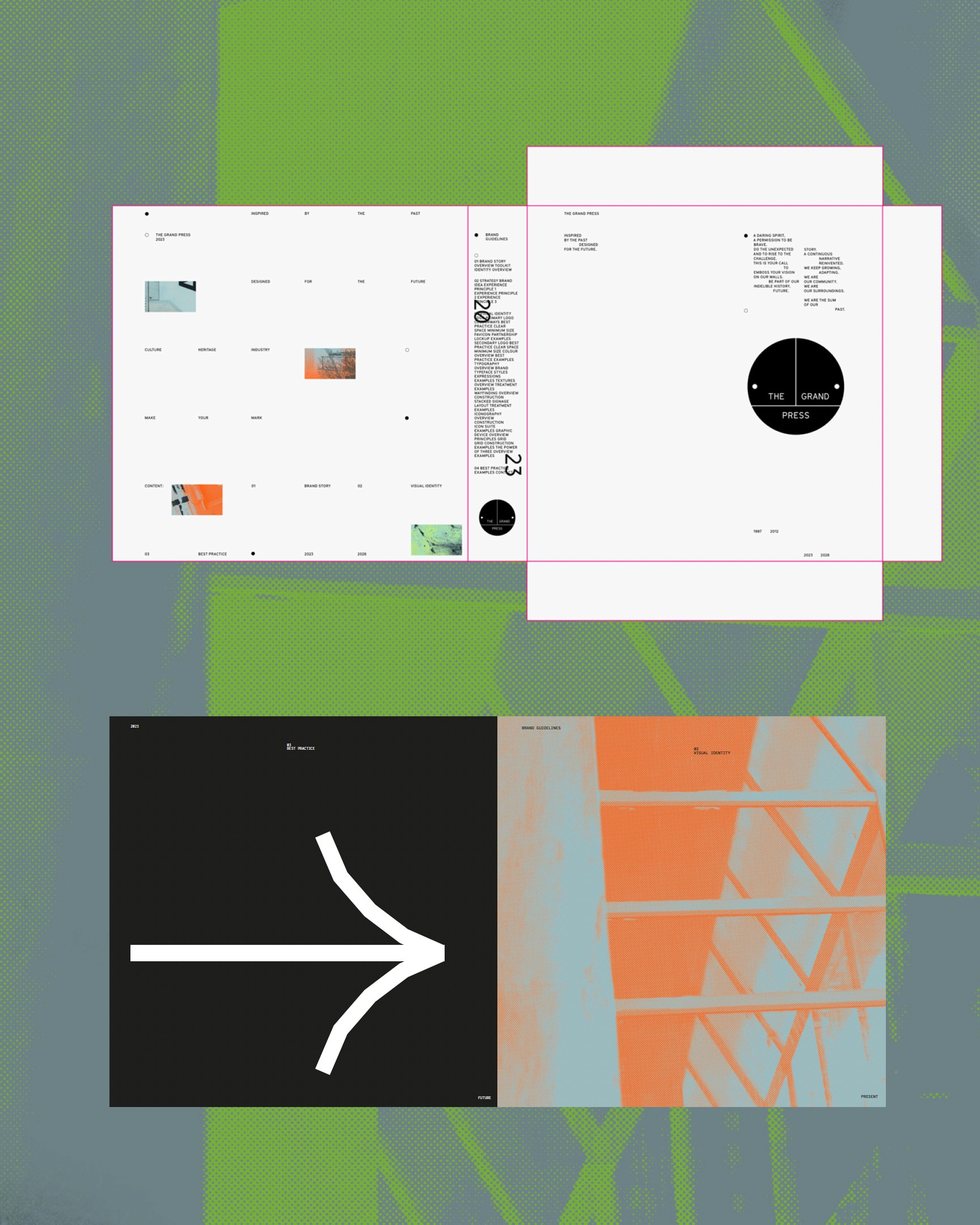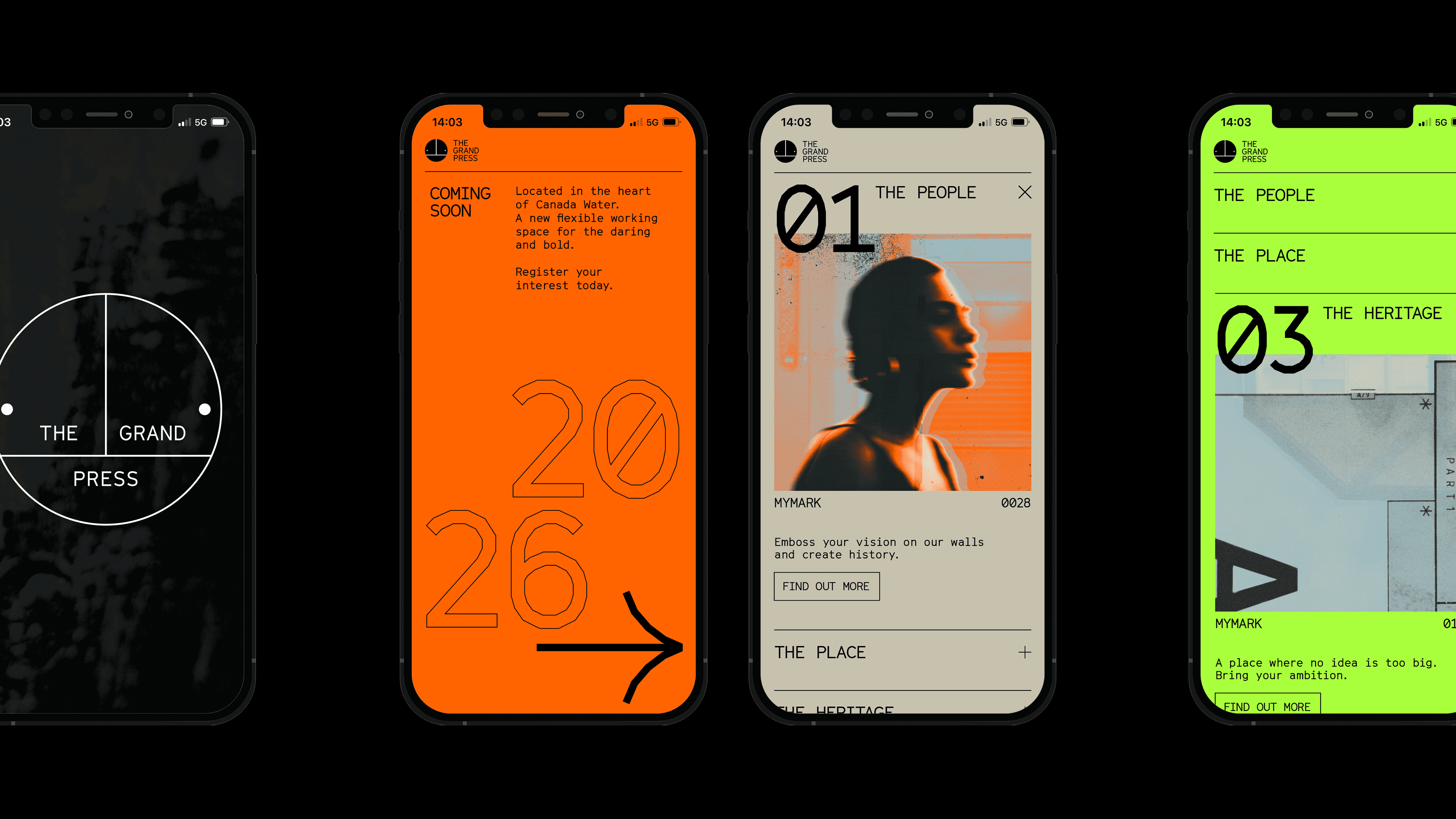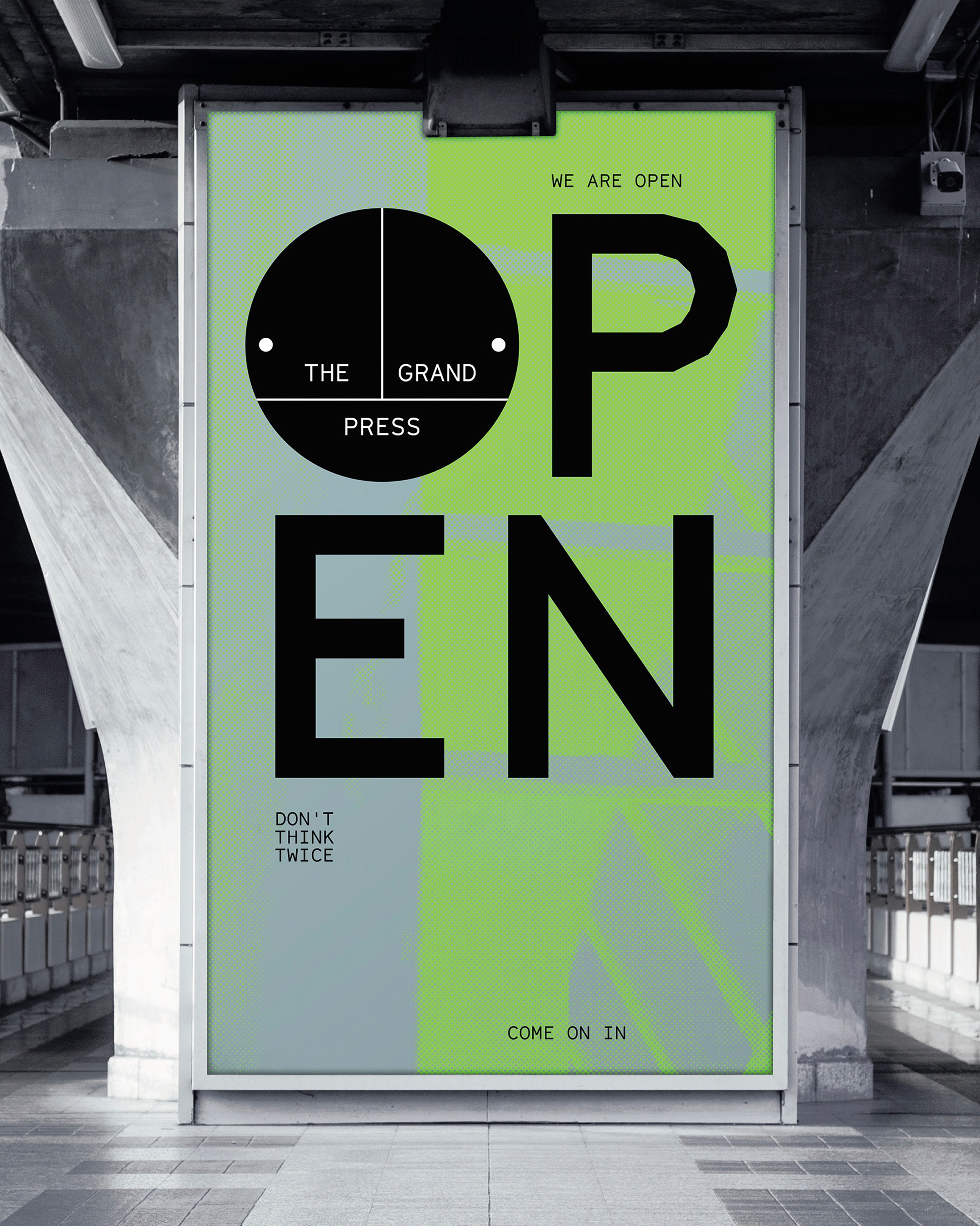 With the team at DixonBaxi, I worked on the rebranding of the iconic venue Printworks, which is now evolving into a cultural and co-working space.We created a brand born from the building’s heritage and built for the future, preserving the legacy of The Grand Press by embedding it in its identity.The visual contrast of pure forms, graphic shapes, and crisp linework fused with distressed concrete and years of layered paint and texture became the basis for The Grand Press design system. The utilitarian wayfinding throughout the original building had a functional beauty and no-nonsense graphic quality that made it a rich source of inspiration. The logo is based on the original signage. It’s an emblematic mark that’s confident, elegant, and timeless, doubling as a graphic device that holds imagery, text, and color.